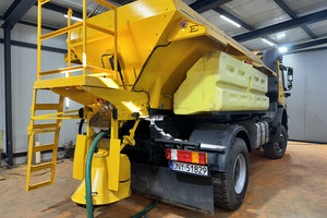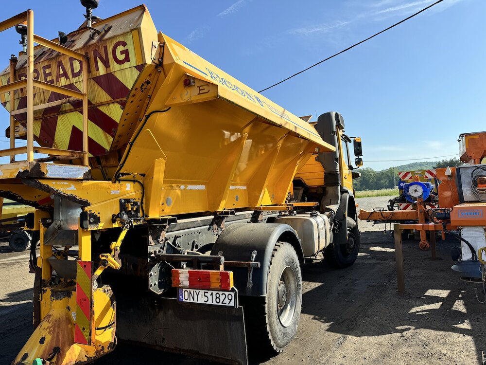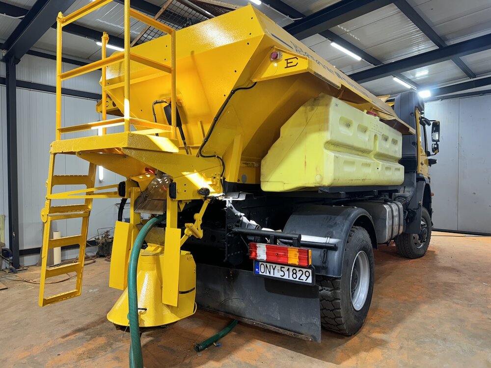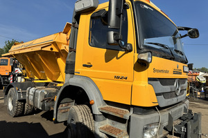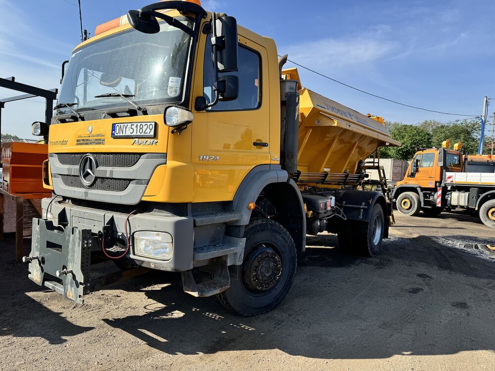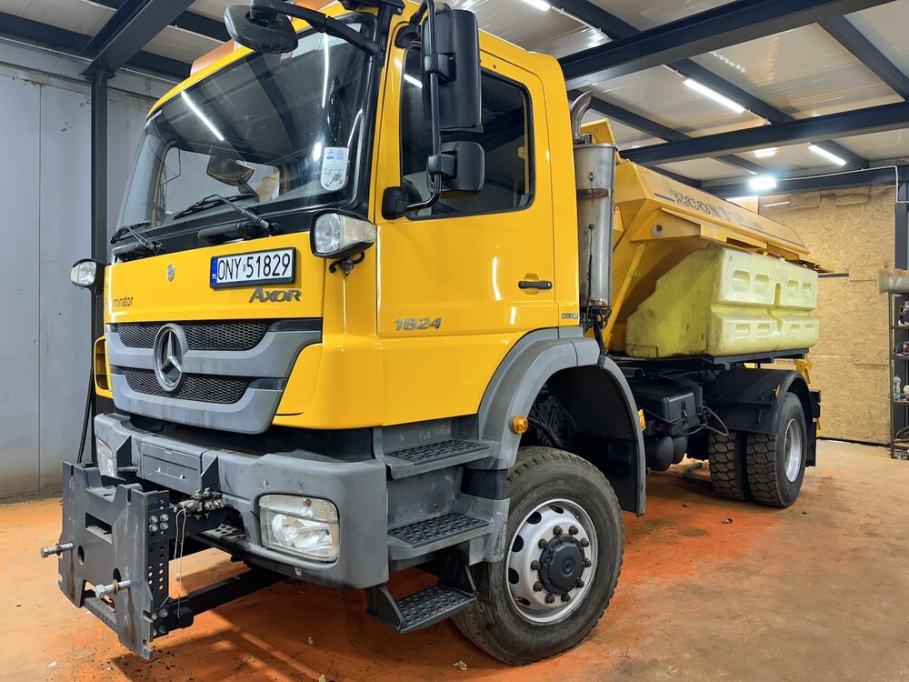 SAMOCHÓD CIĘŻAROWY MERCEDES AXOR 1824 4X4 (Euro 5) -pojazd w wersji komunalnej, -fabrycznie zabudowany pługiem i piaskarką, -napęd 4x4 z dodatkowymi blokadami mostów, -czołownica do montażu urządzeń komunalnych, -przebieg - udokumentowany książką serwisową, -pojazd zakupiony od urzędu gminy - nieużytkowany prywatnie i zawsze serwisowany, -moc 240 KM. -zabudowa piaskarki z podajnikiem taśmowym o pojemności 6m3